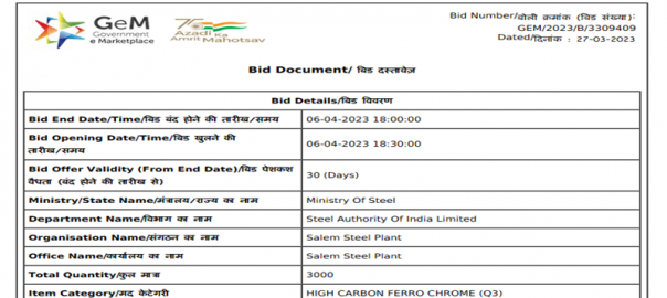 Steel Authority of India Ltd (SAIL) has issued a purchase tender for 3,000 t of high-carbon (HC) ferro chrome (Cr: 60%, size: 10-150 mm) for its Salem Steel Plant (SSP) based in Tamil Nadu. The last date for submission of bids is 6 Apr’23 and the bid offer is valid for 30 days from the closing date.