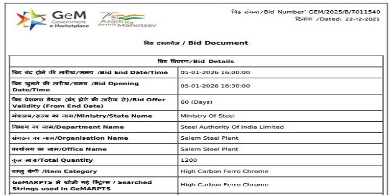 SAIL’s Salem Steel Plant (SSP) has invited bids to procure 1,200 t of high-carbon HC ferro chrome (Cr 57-63%, C 5-8%, 10-70 mm). The bid submission deadline is 5 Jan’26. As per the reverse auction qualification rule, the highest-priced bid will be eliminated. BigMint assessed HC ferro chrome (Cr 60%, 10-150 mm) prices at INR 107,400/t ex-Jajpur on 19 Dec’25.