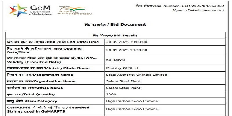 SAIL-Salem Steel Plant (SSP) has floated a purchase tender for 1,200 t of high-carbon ferro chrome (Cr: 57- 63%, C: 5- 8%,10-70 mm). The last date for bid submission is 20 Sep’25, and the bid offer is valid for 60 days from the auction date. BigMint assessed Indian ferro chrome (HC60%,10-150 mm) prices at INR 113,700/t exw-Jajpur on 5 Sep’25.