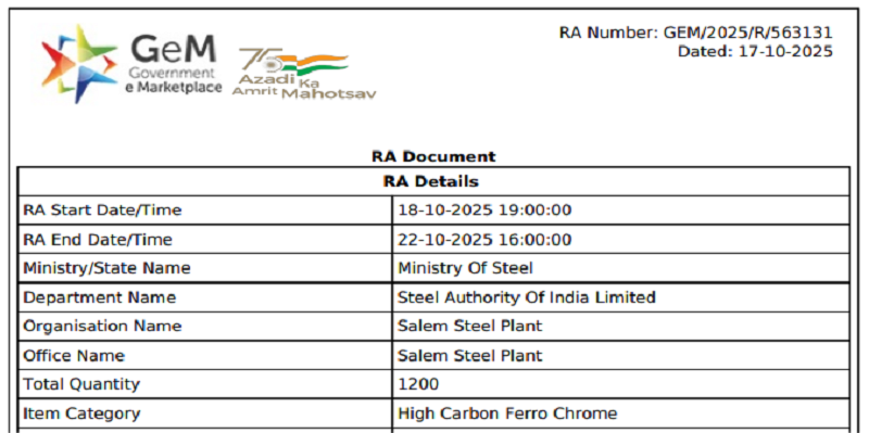 SAIL-Salem Steel Plant (SSP) had floated a purchase tender for 1,200 t of high-carbon (HC) ferro chrome (Cr: 57-63%, C: 5-8%, 10-70 mm). At the reverse auction concluded on 22 Oct’25, the entire quantity was booked at around INR 130,400/t ($1,486/t) FOR, excluding GST. As per BigMint’s assessment on 24 Oct’25, ferro chrome (HC 60%, 10-150 mm) prices stood at INR 120,400/t ($1,373/t) exw-Jajpur.