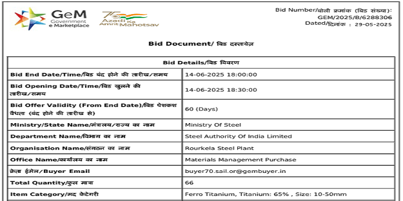 SAIL’s Rourkela Steel Plant (RSP) has floated a purchase tender for 66 t of ferro titanium (Ti: 65% min, size: 10-50 mm). The deadline for bid submission is 14 Jun’25. The tender includes a reverse auction qualification clause, with the highest-priced bids subject to elimination. BigMint assessed ferro titanium (Ti: 70%, 10-50 mm) prices at INR 340,000/t exw-India on 29 May.