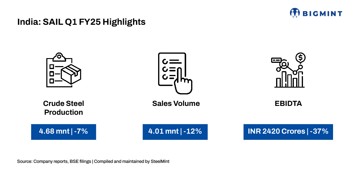 PSU Steelmaker, Steel Authority of India Limited (SAIL), has posted q-o-q drop in crude steel production, sales in Q1FY’25. The Ministry has given a capex of around INR 6,300 crores for FY25.