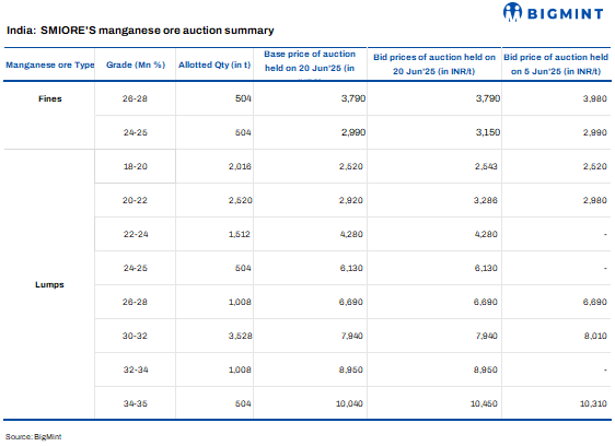 On 20 June 2025, Sandur Manganese and Iron Ore (SMIORE) conducted an auction for a total of 24,192 tonnes (t) of manganese ore, comprising both fines and lumps with (Mn 18-35%), and particle sizes from -10 mm to 100 mm. The auction witnessed moderate participation, resulting in the successful sale of approximately 13,608 t accounting for nearly 56% of the total quantity offered.