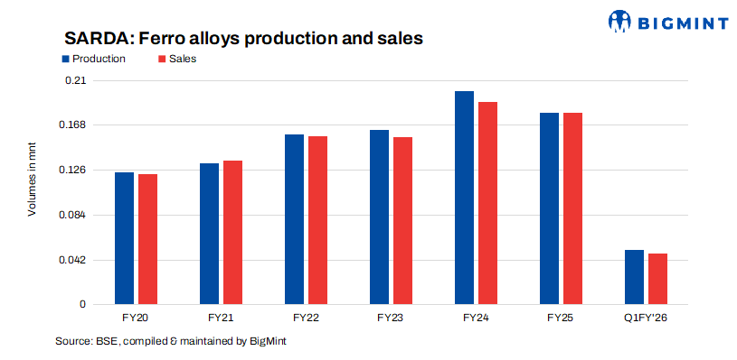 - Sarda Energy and Minerals Limited (SEML), an integrated steel producer, reported a 9% increase in ferro alloys production to 0.051 mnt in Q1FY’26 (Apr-Jun’25) compared to 0.047 mnt in Q1FY’25.