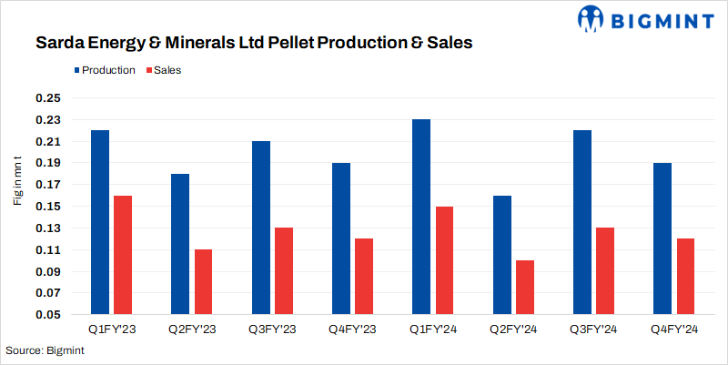 - However, pellet output decreased by 13% to 195,000 t in Q4FY24 as against 224,000 t in Q3FY24.