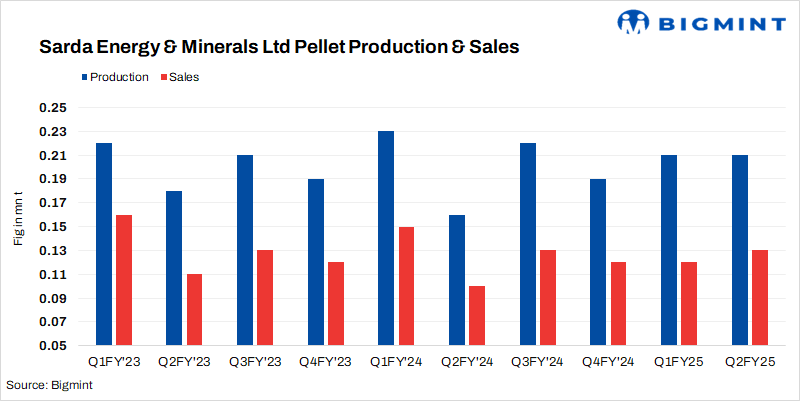 - Meanwhile, pellet output rose 2% q-o-q to 214,000 in Q2FY’25 as against 210,000 t in Q1FY’25.