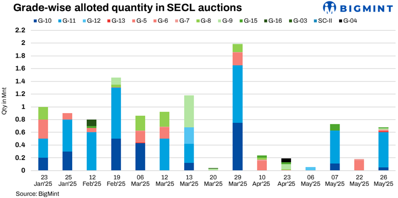CIL subsidiary South Eastern Coalfields Ltd (SECL) allocated 676,200 tonnes of thermal coal in its auction held on 26 May 2025. G11 grade coal accounted for the largest share of the bookings, with prices across most grades reflecting steady premiums over notified rates.
