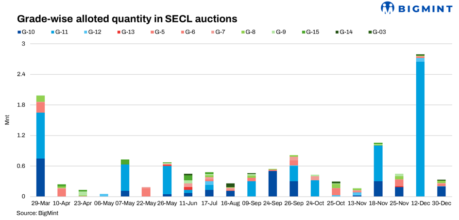 Demand was uneven across grades. G10 dominated allocations, accounting for nearly 60% of total sold volumes, though premiums remained moderate, suggesting volume-driven procurement. In contrast, G8 and G7 attracted stronger premiums, reflecting tighter availability and steady interest from sponge iron and industrial consumers. G6 and lower-CV grades such as G12 and G14 cleared entirely at floor prices, highlighting strict price discipline in utility-linked segments.