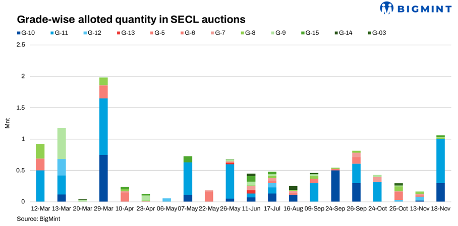 SECL auctions are likely to maintain firm premiums through late November due to tight supply of high-CV and underground grades, rising demand from sponge iron and aluminium sectors, and falling reliance on imported coal of mid-CV grades due to higher landing costs.