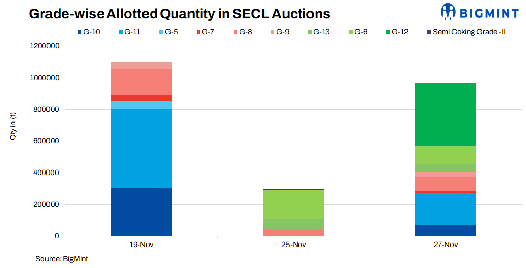 South Eastern Coalfields Ltd (SECL) will auction 0.49 mnt of non-coking coal in Dec’24, across three events. On 27 Dec’24, 35,200 t (grades: G5, G6, G7, G8, G9, G11) will be offered, followed by 43,000 t (grades: G6, G7, G8, G9) on 28 Dec’24. On 30-31 Dec’24, 414,000 t (Grades: G6, G7, G8, G9, G12) will be auctioned.