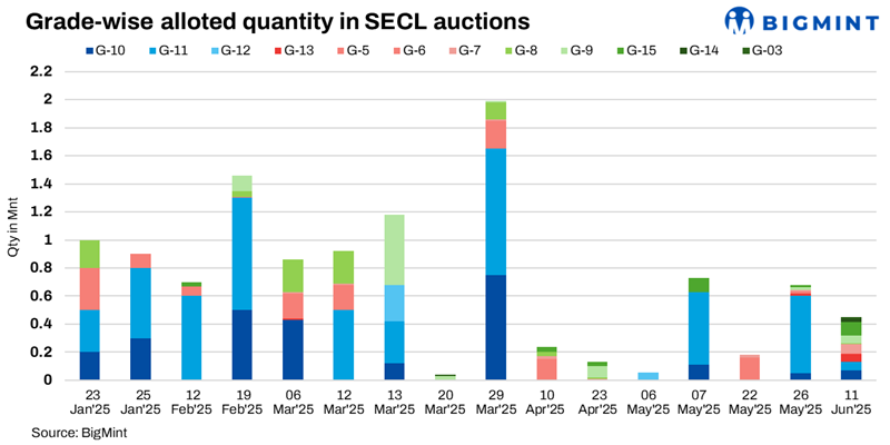 SECL is set to conduct a two-day e-auction on 18-19 Jun’25, offering over 1.53 mnt of non-coking coal. Around 790,000 t will be offered on 18 Jun, covering grades G6-G11. On 19 Jun, 746,650 t will be auctioned, including a wider grade mix of G5-G15, catering to varied industrial demand.