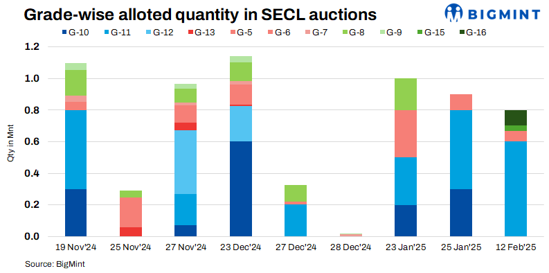 - G11: G11 remained the highest allocated grade in both the auctions. Notably, 604,000 t were allotted on 12 February at an average bid price of INR 1,868/t, slightly lower than in the 23 Jan auction, where 474,000 t were allocated at INR 1,904/t. Steady demand for this grade, primarily from power and cement players, indicates its essential role in bulk industrial usage.