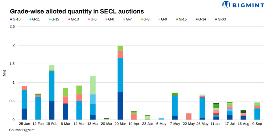 South Eastern Coalfields Ltd (SECL) sold around 462,200 t of coal in its auction held on 9 September 2025, with G11 dominating.