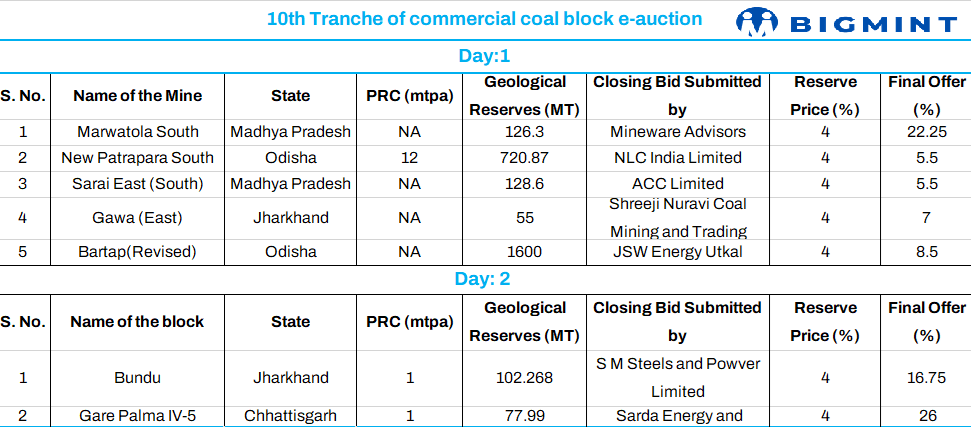 On 21 October, 2024, the Ministry of Coal opened the bids for the 10th round of commercial coal mine auctions, along with the second attempt for the 8th and 9th rounds. Out of the 61 coal mines offered in the 10th round of auctions, a total of 43 bids were received for 16 mines. Key bidders included JSW Energy, JSW Steel, NMDC, JSP, ACC, and NTPC. Following the evaluation of bids, forward e-auctions began on 21 November, 2024, for nine coal mines.