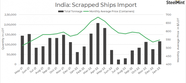 A total of 16 ships comprising 1,16,140 LDT arrived at Alang Port for recycling in Jan’23. These volumes were higher by 54% from 75,632 LDT arrived in Dec’22. The Indian ship-breaking market was active last month. The average price increased by 2% m-o-m to $547/LDT. Indian prices and demand continue to lead the rankings in the ship recycling industry across the continent.