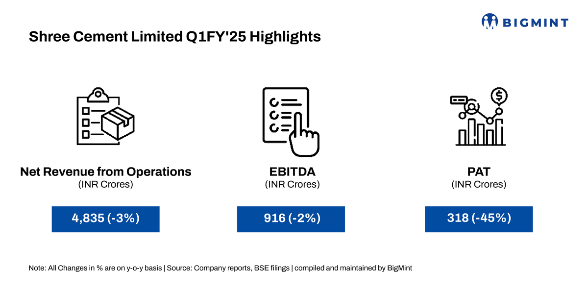 Shree Cement Limited’s Q1FY’25 net revenue from operations dropped 3% y-o-y to INR 4,835 crore as against INR 4,971 crore in Q1FY’24. EBITDA edged lower by 2% on the year to INR 916 crore during the quarter from INR 933 crore in the CPLY. Meanwhile, sales volumes registered 8% y-o-y growth to 9.64 mnt in Q1 and sale of premium products stood at 7.6% of total trade sale volumes.