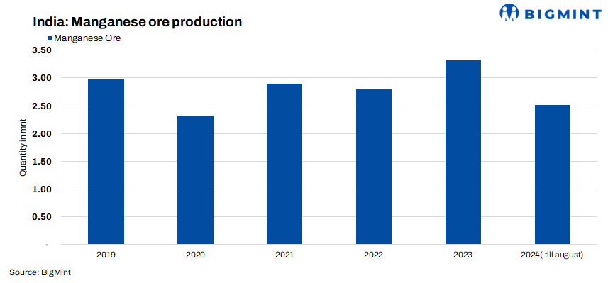 Shyam Metalics And Energy Limited emerged as the preferred bidder for the Naganwat Badi & Choti (Block-D) manganese block in the auction concluded on 20 Nov’24 at a bid premium of 165%. The block with area of around 74.69 Ha, is located in Madhya Pradesh and has geological resources of 67,200 t that have an average Mn grade of 32.41%.