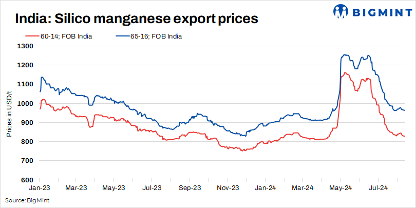 BigMint’s assessment on 12 August 2024 revealed a mixed trend: the 65-16 grade (SiMn 65-16) fell by $14/t to $963/t FOB, while the 60-14 variety saw a sharper decline of $16/t to $828/t FOB. Major producers in Vizag and Raipur were compelled to keep their silico manganese 65-16 grade prices nearly flat, within an FOB range of $960-$970/t, owing to weak overseas demand.