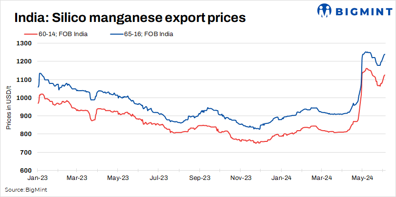 According to BigMint’s assessments on 3 June 2024, the 60-14 grade was assessed at $1,121/t FOB, increasing by $53/t w-o-w, and the 65-16 grade was at $1,238/t FOB, up $58/t w-o-w. Furthermore, some major producers in Vizag and Raipur were offering SiMn 65-16 grade ex-Vizag/Haldia at an FOB of $1,240-$1,250/t, on the back of the surge in high grade imported and domestic manganese ore prices. This also led to limited supply in high-grade manganese ore.