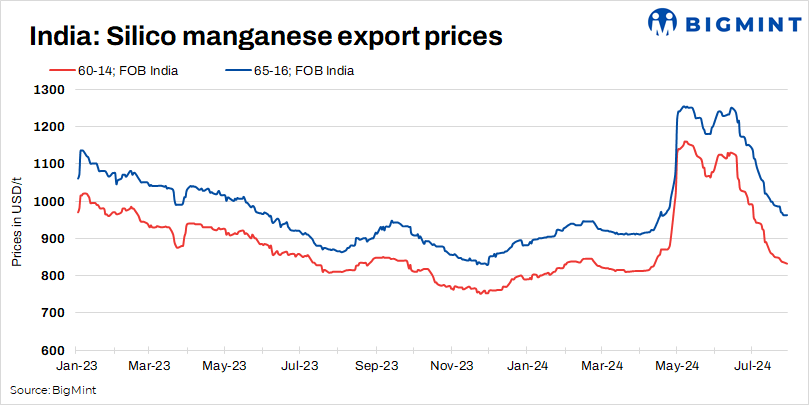 BigMint’s assessment on 29 July, 2024, indicated a decline in Indian silico manganese export prices. The SiMn 65-16 grade experienced a $23/t decline to $962/t FOB, while the SiMn 60-14 grade fell by $13/t to $832/t FOB (Haldia/Vizag). These declines further deepened the falling trend.