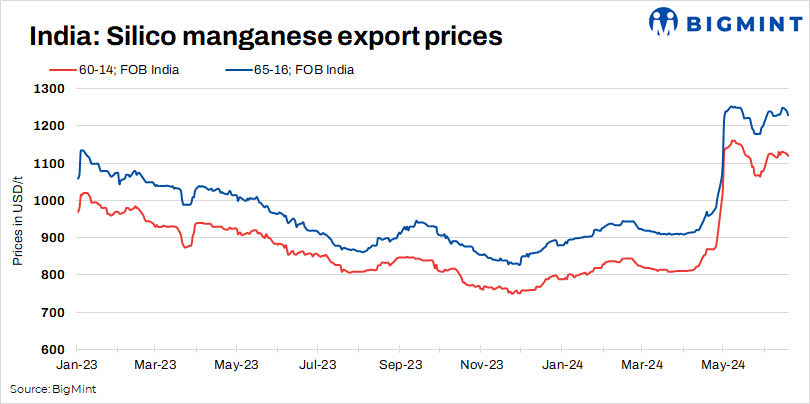 BigMint’s assessments on 17 June, 2024, showed a mixed trend, with the 65-16 grade (SiMn 65-16) touching $1,220/tonne (t) FOB, down by $10/t FOB while the 60-14 variety declined by a steeper $43/t FOB to $1,072/t FOB. Major producers in Vizag and Raipur were forced to maintain their silico manganese 65-16 grade almost flat at an FOB range of $1,210-$1,220/t, due to limited demand for the material.