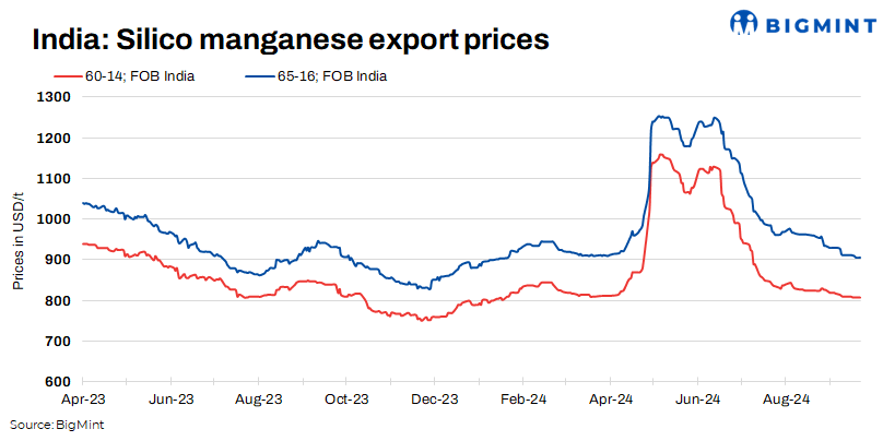BigMint’s assessments on 23 September, 2024, remained firm, with the 65-16 grade nearly steady at $906/t FOB, slightly down by $6/t w-o-w. The 60-14 category was stable with a minor dip of $2/t FOB w-o-w to $808/t FOB as sellers were forced to maintain the same rates due to limited demand for high-grade manganese alloys.