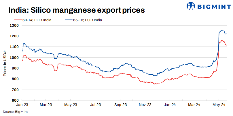 According to BigMint’s assessments on 20 May 2024, the 60-14 grade was assessed at $1,115/t FOB, decreased by $35/t w-o-w, and the 65-16 grade was at $1,220/t FOB, a drop of $30/t w-o-w. Furthermore, some major producers in Vizag and Raipur were offering SiMn 65-16 grade ex-Vizag/Haldia at an FOB of $1,230-$1,240/t.