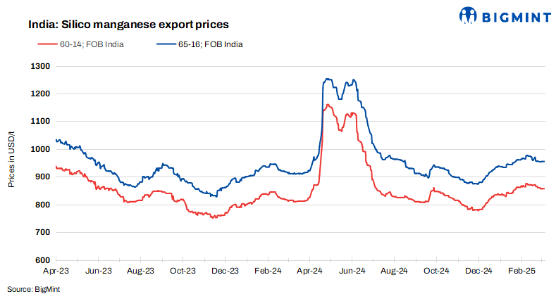 Indian silico manganese export prices edged down w-o-w, amid subdued demand, with most buyers having fulfilled their material requirements in February, in expectation of price hikes for March deliveries. Procurement was limited, as buyers adopted a wait-and-watch approach, closely monitoring future market trends.