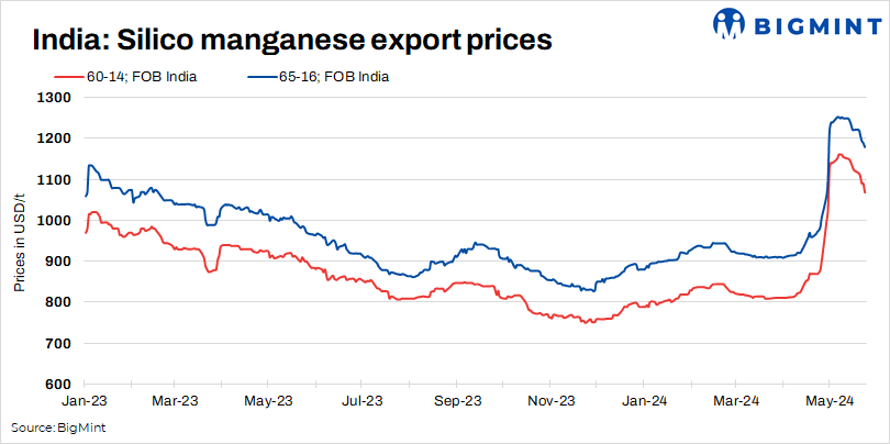 Lower enquiries from Italy: Italian steel production fell by 10.6% y-o-y in April 2024, reaching 1.7 mnt, as per GMK Center. This decline continued from March, with a further 11% drop. Weakening global demand for steel and high energy costs are to blame. The impact is felt in reduced consumption of silico manganese from India. As per data maintained with BigMint, Italy’s silico manganese imports from India plunged 18% m-o-m to 12,146 t in March. Notably, Italy is one of the key silico manganese export destinations.