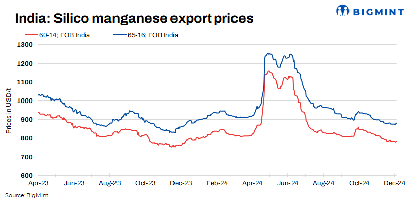 Indian silico manganese export prices held steady w-o-w, despite tepid demand impeding deal closures. Rising manganese ore tags provided support and offset downward pressures. However, market sentiment remains cautious. As per BigMint’s assessment on 16 Dec’24, the 65-16 grade inched up by $5/t w-o-w to $880/t FOB, while the 60-14 variant remained stable w-o-w at $782/t FOB Vizag/Haldia, India.