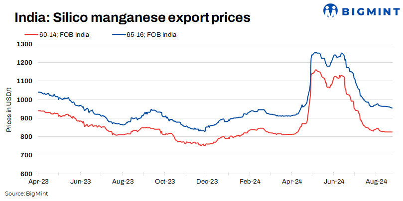 BigMint’s assessments on 26 August, 2024, remained firm, with the 65-16 grade prices keeping stable with a minor decline of $6/t steady at $954/t FOB and the 60-14 grade remained stable at $825/tonne (t) FOB. Major producers in Vizag and Raipur kept the SiMn 65-16 grade available at a FOB range of $960-$970/t, as sellers were forced to maintain the same rates due to limited demand of silico manganese across the grade amid fluctuating prices for imported ore.