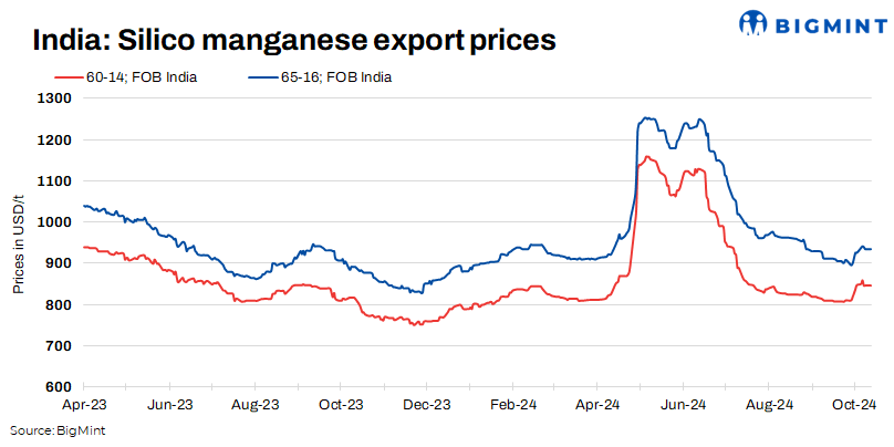 BigMint’s assessments on 14 October, 2024, were largely stable, with the 65-16 grade prices keeping stable with a minor decline of $3/t w-o-w, remained steady at $935/t FOB and the 60-14 grade stood at $847/tonne (t) FOB, with minor fall of $4/t w-o-w. Major producers in Vizag and Raipur kept the SiMn 65-16 grade available at a FOB range of $940-$950/t, as sellers were forced to maintain the same rates. Inquiries of silico manganese remained subdued across the grade amid fluctuating prices for imported ore.