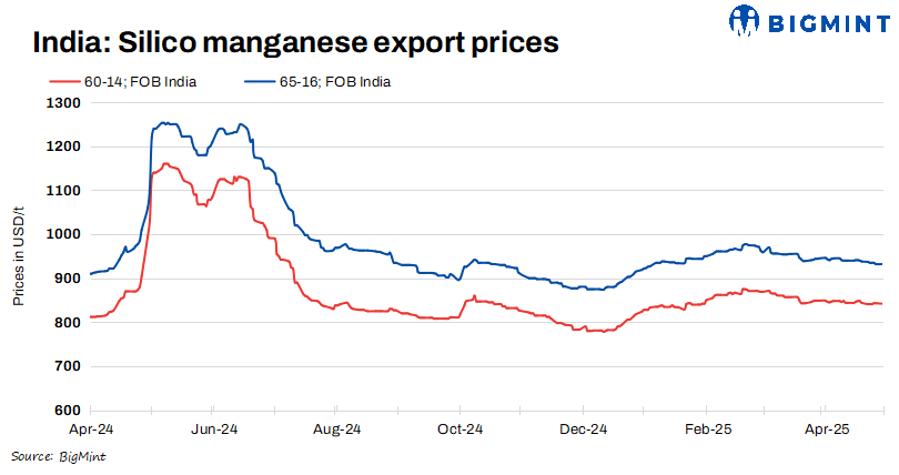 Indian silico manganese export prices held largely stable w-o-w, amid sluggish procurement and falling imported manganese ore costs. As of 5 May’25, BigMint assessed 65-16 grade at $931/t FOB, down $1/t w-o-w, while 60-14 grade prices dropped $2/t to $840/t FOB. Prices may remain under slight pressure due to subdued global steel demand and prevailing market caution.