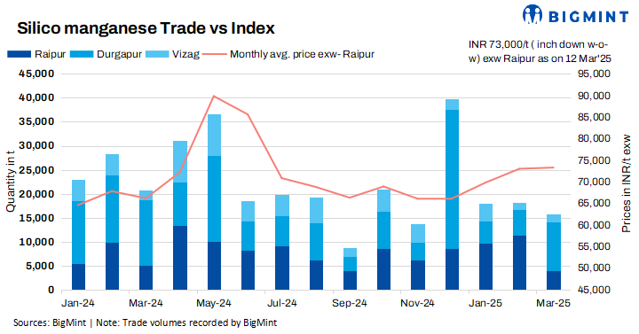 Domestic prices of 60-14 grade silico manganese edged down w-o-w by INR 550/tonne (t) ($6/t) to INR 71,600-73,100/t ($821-838/t) exw on 11 March 2025, as per BigMint’s assessment. Prices decreased due to the ongoing supply-demand imbalance in the market, coupled with persistent decline in steel demand. These factors have contributed to a reduction in market activity and pricing pressure across key producing regions.