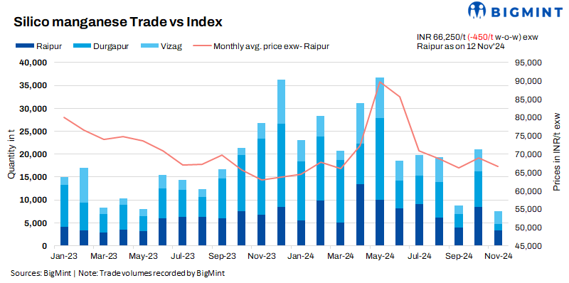 Steel prices remain firm w-o-w: The domestic silico manganese market is weakening due to a slowdown in the Indian steel market. Stable prices, modest demand, and limited bulk bookings have reduced demand for silicon manganese in domestic steel mills. This has led to a cautious buyer approach. BigMint’s daily steel billet index closed at INR 39,500/t exw-Raipur on 13 November 2024, a w-o-w inched up by INR 300/t. Despite the fluctuating prices, caution prevails, with buyers hesitant to commit to large-scale purchases.
