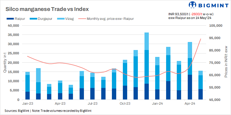 BigMint’s assessments on 14 May revealed a substantial w-o-w decrease of INR 1,700-2,600/t ($94-$116/t) for grade 60-14 silico manganese. Prices of this grade were assessed yesterday at INR 93,400-96,100/t ($1,120-$1,151/t) ex-works. Notably, offers in Raipur were at INR 95,000-96,100/t ($1,138-$1,151/t) exw.