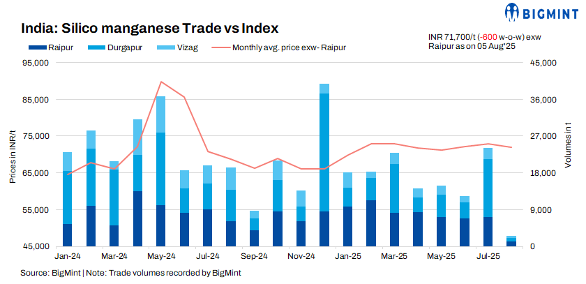 Silico manganese prices in India dropped by INR 600/t ($7/t) w-o-w due to weak domestic demand from steel mills. Export inquiries also saw a slight dip amid uncertainty over EU safeguard duties, though no clear implementation timeline has emerged yet.