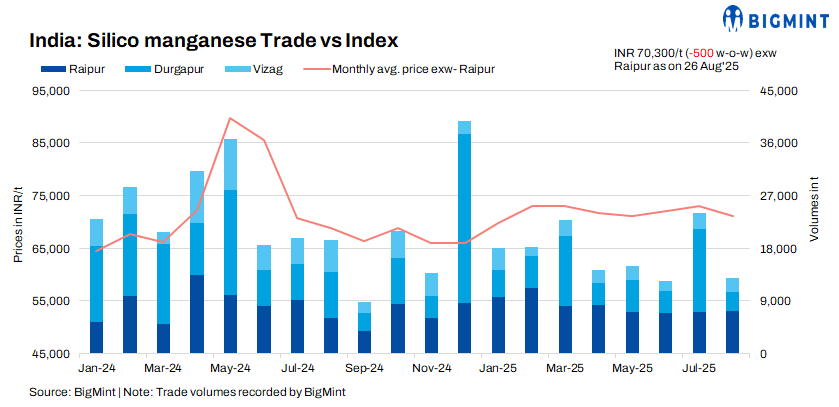 According to BigMint’s assessment on 26 August 2025, domestic silico manganese (60-14 grade) prices in Raipur stood at INR 70,300/t ($802/t) exw, down by INR 500/t ($6/t) w-o-w, while in Durgapur, tags were at around INR 70,200/t ($801/t), falling by INR 600/t ($7/t). Vizag saw the sharpest drop of INR 900/t ($10/t) to INR 70,000/t ($798/t). Prices in Raipur have hit a three-month low, as per data maintained with BigMint.
