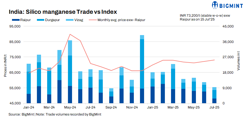 Domestic silico manganese prices have stabilised this week following a previous upward trend seen in mid-June 2025 on production curtailments. Prices have come down slightly by INR 300/t over the last couple of days. The price drop is primarily attributed to softening demand and a decline in steel prices, which has significantly impacted pricing dynamics.