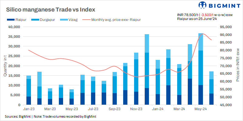 BigMint’s assessment on 25 June exhibited a sharp decline in prices by around INR 3,200-3,850/t ($38-$46/t) for grade 60-14 silico manganese. Prices fell by INR 3,200-3,850/t ($ 38-46/t) across key regions like Raipur, Durgapur, and Vishakhapatnam. This decline brings prices to around INR 77,000-78,500/t (USD 921-940/t) ex-works, near a two-month low according to BigMint’s data.