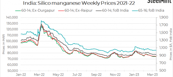 • Last week, domestic steel demand was moderate with limited booking enquiries, and so silico manganese prices remained stable. SteelMint’s IF steel billet index was at INR 46,375/t, down INR 150/t ex-Raipur on 14 March.