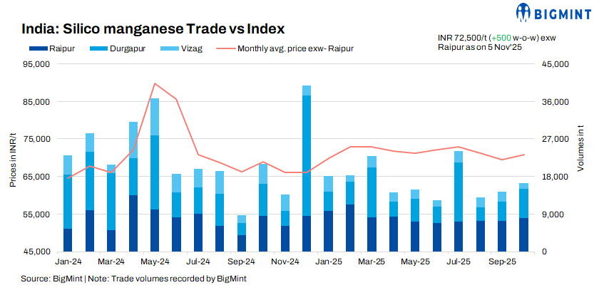 As per BigMint’s assessment on 04 November 2025, domestic prices of silico manganese (60-14 grade) witnessed an uptrend across key regions. In Raipur, prices reached INR 72,200/tonne (t) ($814/t) exw, reflecting a w-o-w increase of INR 500/t ($6/t).
