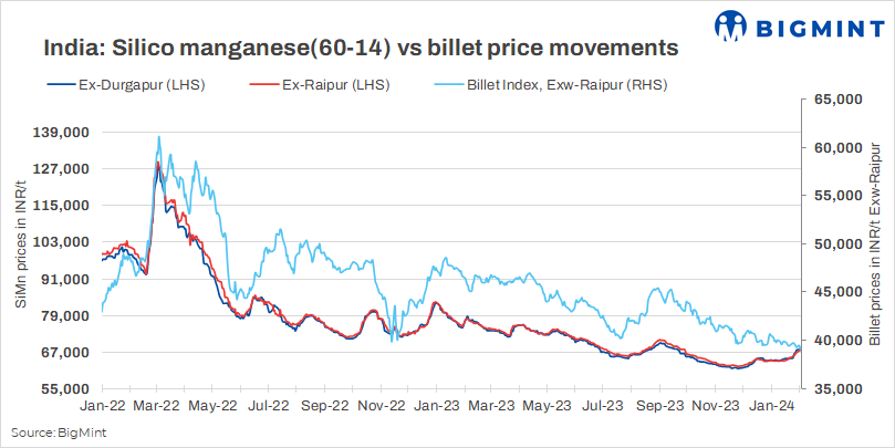 Prices of silico manganese in India rose by around INR 1,700/t ($21/t) w-o-w reaching a 4-month high, as these levels were last seen in September 2023. Improved inquiries for exports and domestic demand led to supply tightness.