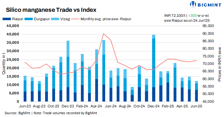 Domestic prices of 60-14 grade silico manganese were rangebound this week, with slight fluctuations in key regions, according to BigMint’s assessment on 24 June 2025. Prices on exw-Raipur basis were at around INR 72,100/tonne (t) ($835/t), up by INR 300/t ($3/t) w-o-w, and exw Durgapur inched up by 450/t($5/t) w-o-w to 71350/t and Vizag observed a slight decline of INR 100/t ($1/t) to INR 71,200/t ($820/t) exw.