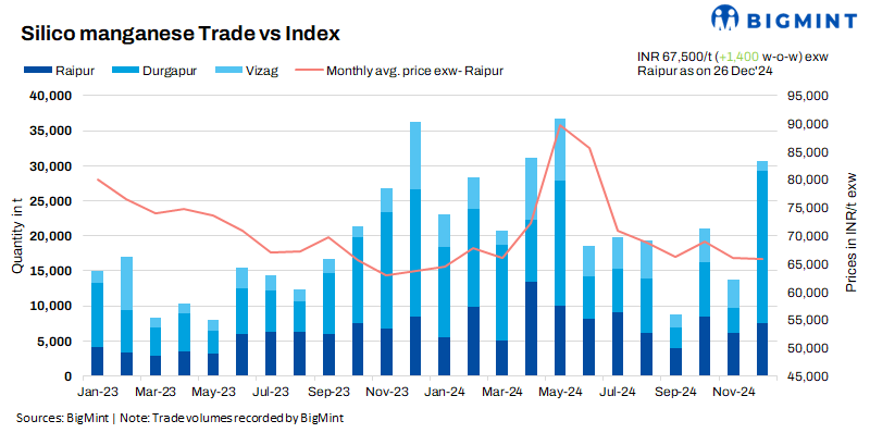 According to BigMint’s assessment on 23 December 2024, domestic prices of the 60-14 grade of silicomanganese inched up by INR 1,000/tonne (t) ($10/t) w-o-w to INR 66,800-67,200/t ($783-788/t) exw, though some smelters in Raipur offered material at INR 67,500-68,000/t ($783-$788/t) exw. Prices have hit the highest since end-Oct’24.