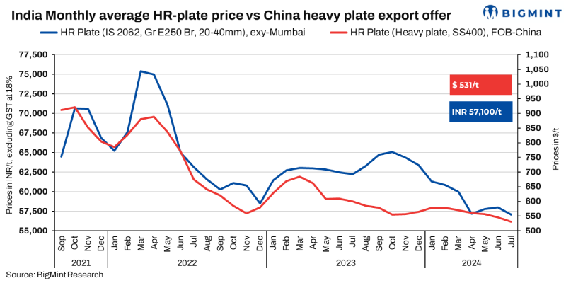 The monthly average trade-level prices of hot-rolled (HR) plates (E250 Br, 20-40mm) in the Mumbai region have dropped to 4-month low levels close to that in December 2023. The monthly average prices of HR plates (E250 Br, 20-40mm) stood around INR 57,100/t exy-Mumbai levels in July 2024 declining by INR 850/t ($10/t) m-o-m.