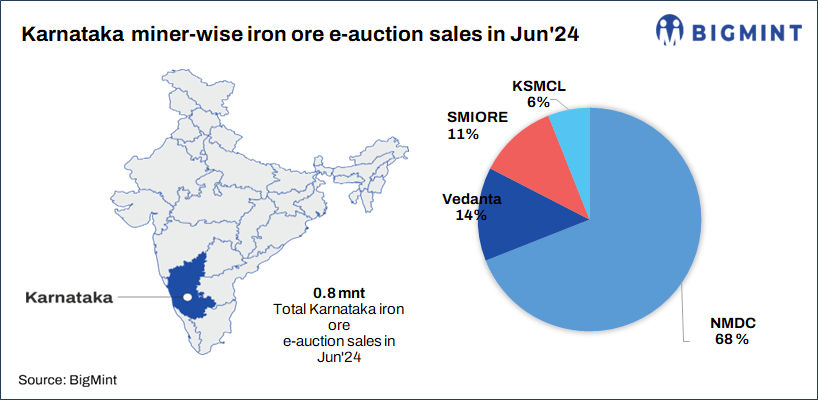 SMIORE has scheduled an auction for 25,000 t of iron ore lumps (5-40 mm, Fe 54.30-57.70%) from its Sandur mines in Karnataka on 20 Jul’24. The floor prices are yet to be declared, which include royalty, DMF and NMET. In the last auction on 11 July, 12,000 t fines (Fe 55.70%) got booked at INR 2,980/t while 20,000 t lumps (5-40 mm, Fe 54.3-59.2%) got booked at INR 4,040-5,890/t.