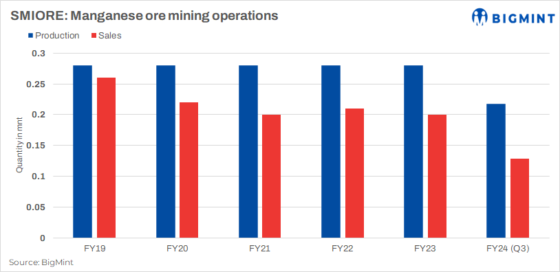 Sandur Manganese and Iron Ores (SMIORE) recorded ferro alloys production at 6,344 t, dropped by 12% q-o-q in Q3FY’24. Tepid demand scenario coupled with a further decline in realisations during Q3 were observed. However, sales of ferro alloys increased to 4,363 t q-o-q in Q3FY’24. Meanwhile, manganese ore production stood at 73,000 t in Q3, sales of the same diminished by 23% q-o-q.