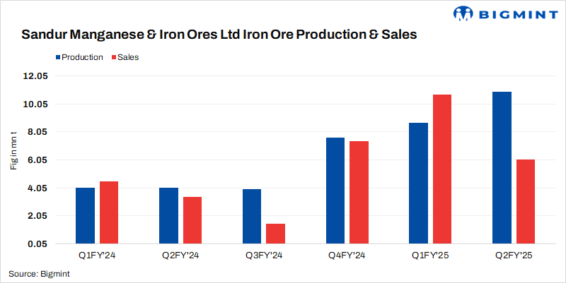 - Sandur Manganese and Iron Ores Limited (SMIORE) recorded iron ore production of 1.96 mnt* in H1FY’25 (Apr-Sep’24), a significant y-o-y rise of 142% as against 0.81 mnt* in H1FY’24.