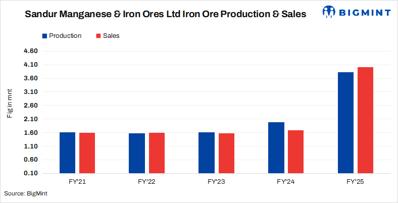 • Sandur Manganese and Iron Ores Limited (SMIORE) recorded iron ore production at 3.81 mnt in FY’25, a significant 93% rise against 1.97 mnt in FY’24.